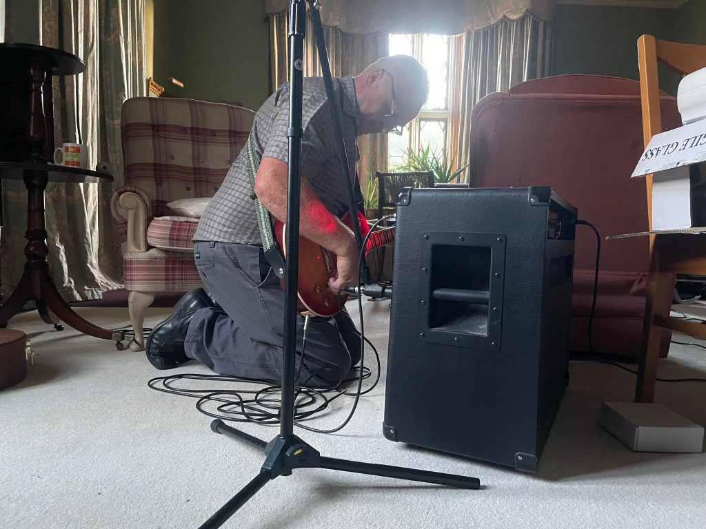 Here he is in the drawing room at Doldowlod cradling a voluptuous guitar in front of an amp of truly agricultural proportions (does it run on red diesel I wonder?) which he carried in with his brother Irfon, who also gave us a reading of The Bright Field, along with the Gibson Watts…