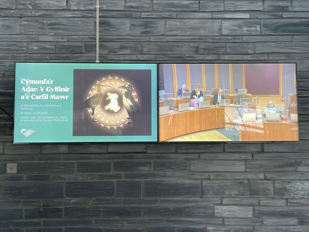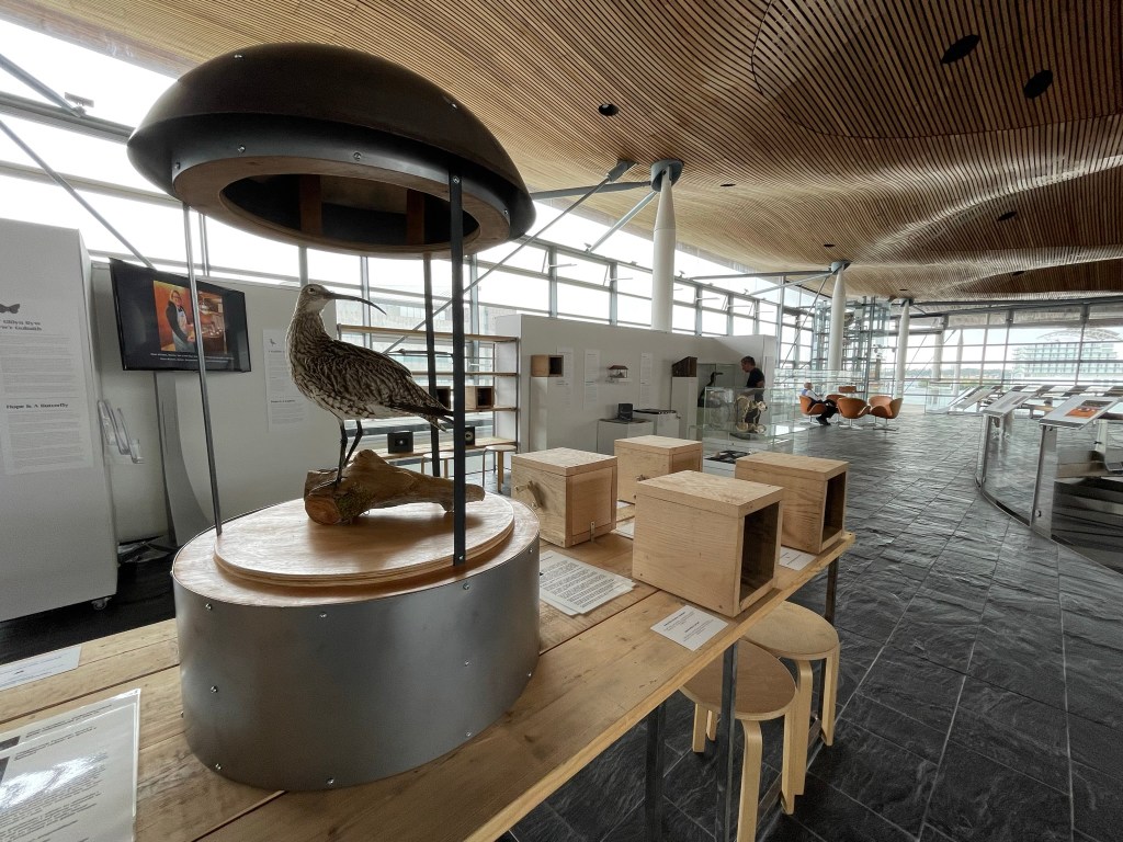 The presence of the curlew – its being and its meaning – within an exhibition in the Senedd might be construed as a ‘culmination’ for we like to place our centralised institutions on pedestals and imbue ‘product’ with undue emphasis. But this is an ongoing process and hopefully encountering it on a daily basis – and even becoming a part of it – will alter the perspective of the politicians whose thoughts and actions shape our daily lives. Perhaps it will have a similar impact on the many visitors from the nation’s capital, from all over Wales and beyond: in highlighting what is important, how values of respect for the land are upheld and why maintaining them is critical to our future well-being. And thus the wider perception of Wales’ ‘backyard’ will change, ultimately benefiting the landscape from which the animated artworks came – and to which they, in due course, will return to reconnect with the inhabitants, human and beyond human, that formed and informed them.