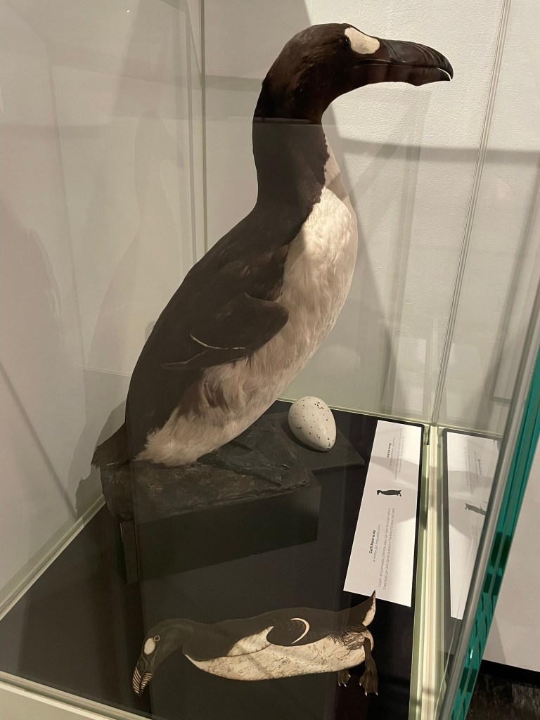 At an almost (geographically speaking) polar opposite, in Canada archaeologists excavating an ancient ‘Maritime Archaic’ Native Indian cemetery at Port au Choix, Newfoundland unearthed a skeleton covered with the skulls of two hundred great auks and adorned with a bone hairpin shaped into the effigy of a great auk’s head. This, along with the great auk’s enduring presence in indigenous mythologies there, strongly suggests that whilst it undoubtedly offered physical sustenance it was more than just the ‘natural resource’ it was to become to European sailors and colonists. Like the huia it was – and is – charged with resonance, part of the collective memory and value system: of the culture of these peoples.