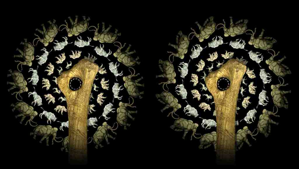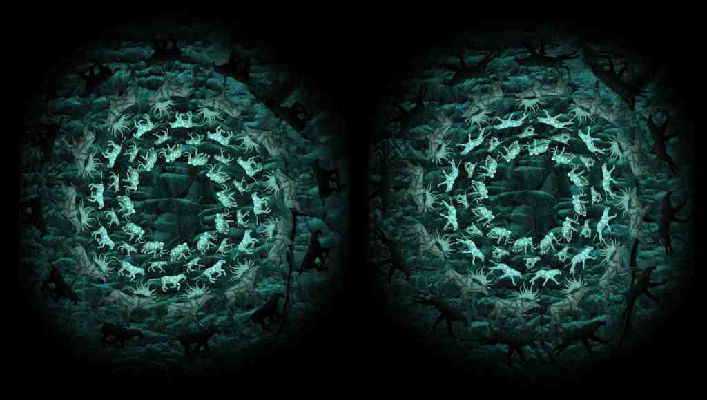 Each flipbook-box constitutes a window on the mind of a ‘Cave Hunter’ covering a timespan from the Late Upper Palaeolithic to the present day. The imagery within is formed from moving creatures, their bones and teeth and extracts from field journals, diaries and other forms of written code.