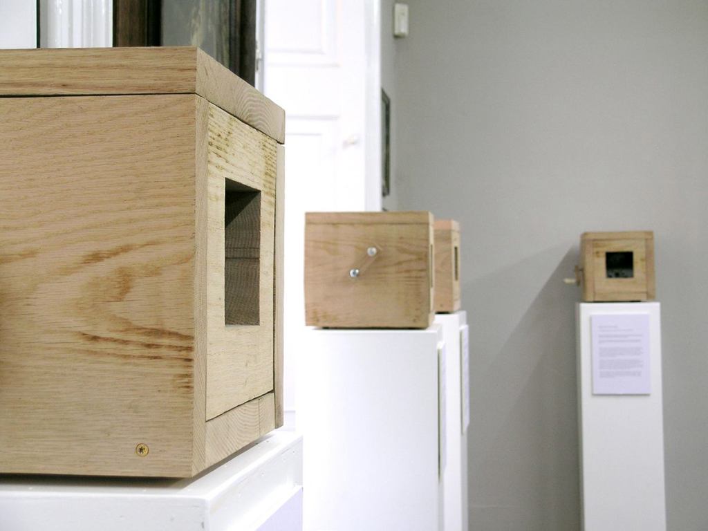 The installation is accompanied by a series of texts, one for each flipbook-box.
